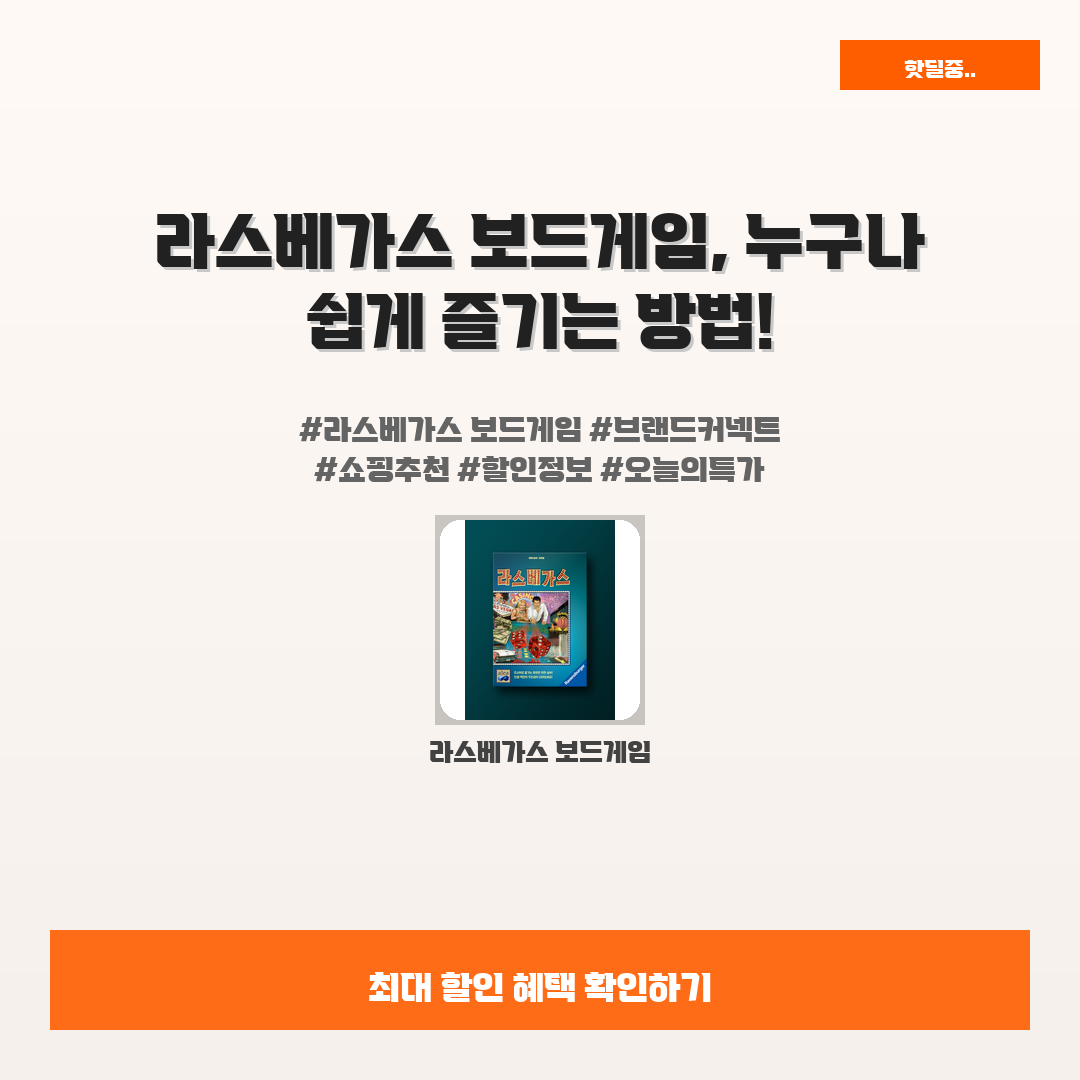 🛍️ 이 포스팅은 네이버 쇼핑 커넥트 활동의 일환으로,판매 발생 시 수수료를 제공받습니다.오늘 소개할 제품은 단언컨데,,그야말로 라스베가스 보드게임의 진수를 보여주는 아이템입니다!요즘 가족이나 친구들과의 게임 시간이 소중하게 느껴지시죠? 라스베가스 보드게임은 그런 소중한 순간을 더욱 특별하게 만들어줄 완벽한 선택이에요."어떤 보드게임이 좋을까?" 고민하던 찰나, 여러분의 고민을 해소해줄 바로 이 제품이 기다리고 있답니다. 쉽고 재미있게 즐길 수 있는 방법을 제공합니다!가격도 완벽해요. 정가는 55,000원이지만, 지금 38,500원으로 30% 할인 중이라니! 저렴한 가격에 큰 즐거움을 누릴 수 있는 기회를 놓치지 마세요!※ 이거 진짜 제가 직접 써보고 쓰는 리뷰예요 광고 아님!!라스베가스 보드게임30%..