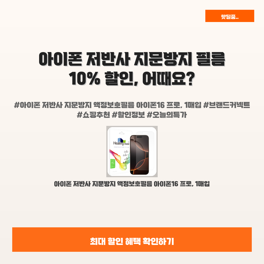🛍️ 이 포스팅은 네이버 쇼핑 커넥트 활동의 일환으로,판매 발생 시 수수료를 제공받습니다.여러분, 아이폰 저반사 지문방지 액정보호필름 아이폰16 프로에 대해 들어보셨나요?이 제품, 정말 필요한 아이템이에요!스크린에 지문이 남는 거 정말 불편하시죠? 매일 사용하는 아이폰 화면이 지저분해지면 기분도 다운되고.... 하지만 이제 걱정 마세요! "아이폰 저반사 지문방지 액정보호필름 아이폰16 프로, 1매입"로 문제를 한 번에 해결해 보세요.이 필름은 뛰어난 저반사 기능으로 햇빛 아래에서도 선명한 화면을 제공합니다. 때문에 촬영할 때 손쉽게 사용할 수 있어요. 여러분도 이 스마트한 선택으로 화면을 깨끗하게 유지하시길 바라요!게다가 지금 10% 할인된 가격으로 제공되고 있어서 더욱 가성비 최고입니다. 딱 요즘 같..