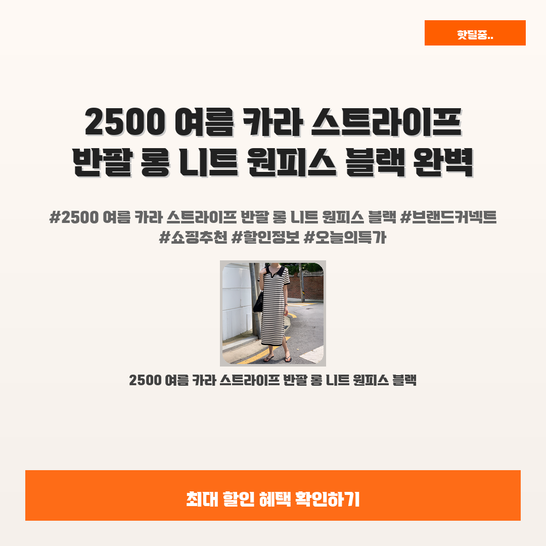 🛍️ 이 포스팅은 네이버 쇼핑 커넥트 활동의 일환으로,판매 발생 시 수수료를 제공받습니다.오늘 소개할 제품은 단언컨데,,그야말로 완벽한, 갓벽한, 감동적인 제품이라구요요즘 여름 준비로 어떤 원피스를 사야 할지 고민되시죠?"2500 여름 카라 스트라이프 반팔 롱 니트 원피스 블랙"는 그 고민을 단번에 해결해줄 최고의 선택이랍니다!이 원피스를 입은 순간, 주변의 시선이 한 곳으로 집중되는 기분을 느낄 수 있어요. 여름의 더위를 잊고, 스타일의 세련미를 한층 끌어올릴 수 있답니다!여러분도 이 행복감 꼭 느껴보셨으면 좋겠어요 진심그리고 이 원피스는 사도 후회 안 해요... 제가 보장함할인된 가격으로 만나볼 수 있는 이 기회를 놓치지 마세요! 판매량이 증명하는 이 원피스의 매력, 여러분도 꼭 경험해보세요!※ 이..
