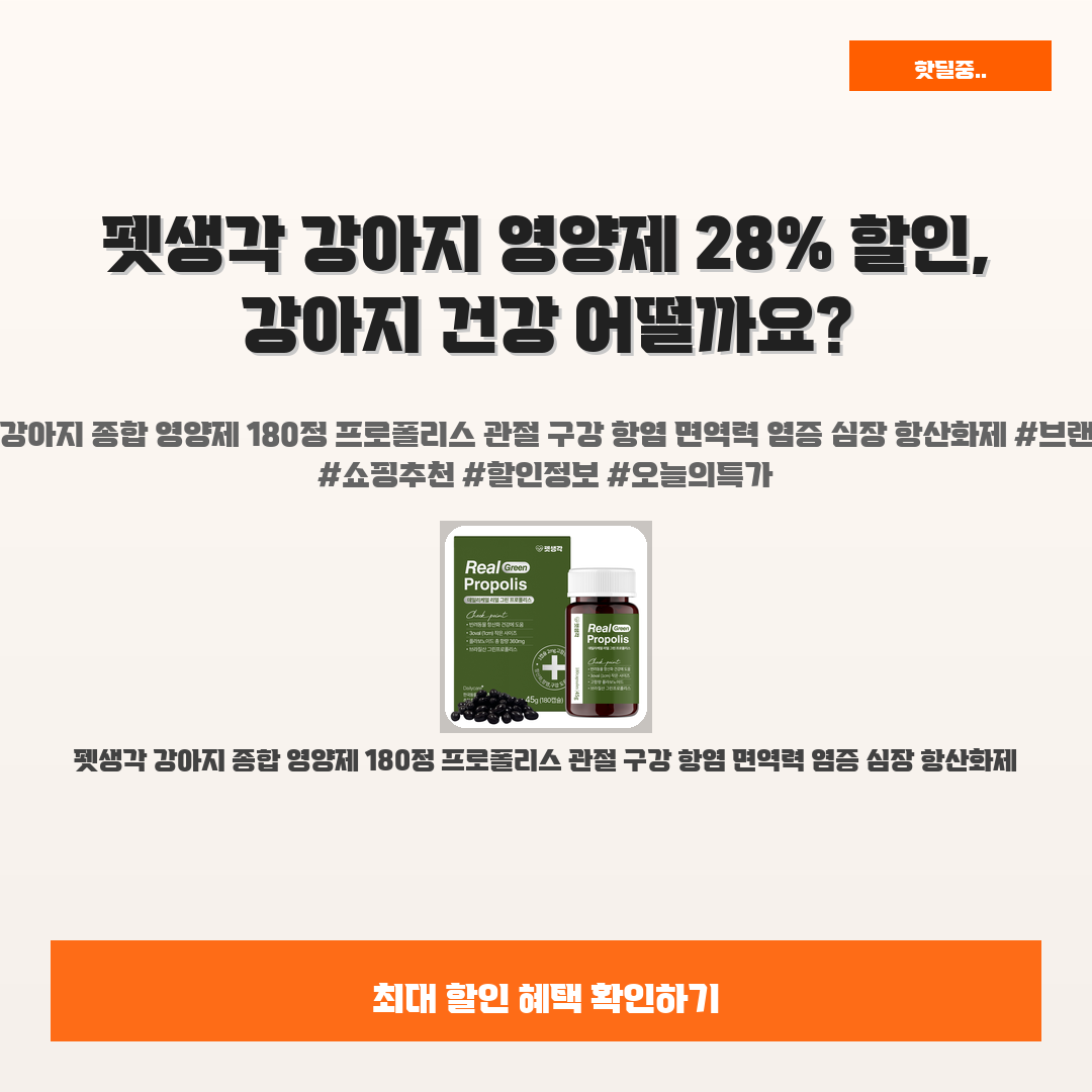 🛍️ 이 포스팅은 네이버 쇼핑 커넥트 활동의 일환으로,판매 발생 시 수수료를 제공받습니다.오늘 소개할 제품은 바로,펫생각 강아지 종합 영양제입니다!강아지가 건강하게 자라길 바라는 마음, 정말 많은 분들이 공감하실 거예요. 하지만 여러분의 반려견은 충분한 영양을 받고 있나요?"펫생각 강아지 종합 영양제 180정"는 관절, 구강, 면역력 등 다양한 건강 문제를 동시에 케어할 수 있는 해결책이에요!특히 프로폴리스와 항산화 성분이 포함되어 있어 강아지의 심장을 건강하게 유지해 주고 염증을 줄여줘요. 이렇게 소중한 우리 강아지를 위해 꼭 필요한 제품이랍니다.지금 28% 할인된 가격으로 만나볼 수 있으니, 여러분의 사랑스러운 반려견에게 최고의 선물을 해주세요!※ 이거 진짜 제가 직접 써보고 쓰는 리뷰예요 광고 아..