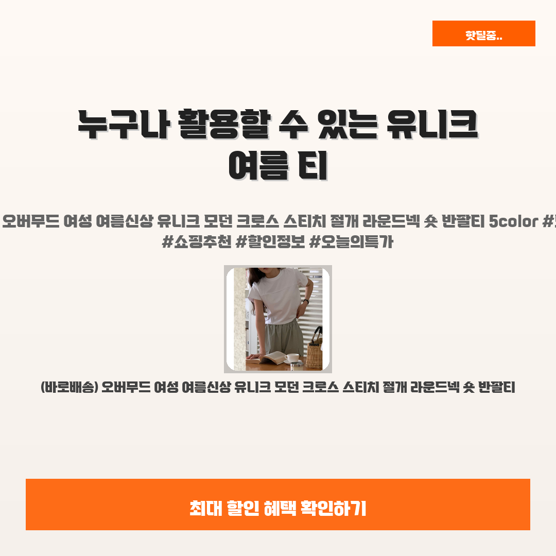 🛍️ 이 포스팅은 네이버 쇼핑 커넥트 활동의 일환으로,판매 발생 시 수수료를 제공받습니다.오늘 소개할 제품은 멋짐의 끝판왕,바로 오버무드 여성 여름신상 유니크 모던 크로스 스티치 절개 라운드넥 숏 반팔티랍니다!여름을 맞아 한 여름의 🔥더위🔥를 무사히 넘기고 싶은 당신, 어떤 티셔츠를 선택할까 고민 중이신가요?우리가 찾던 그 스타일로, 당신의 여름을 더욱 특별하게 만들어줄 [상품명]이 여기 있어요!이 티셔츠는 스타일과 편안함을 모두 갖춘, 친구들과의 모임이나 데일리룩으로도 💖적극 추천💖드려요. 진짜 이 티셔츠 하나로 여름 느낌 제대로! 여러분도 그 매력을 경험해보세요!게다가 가격도 정말 착해요! 여름 시즌을 만끽하며 스타일을 업그레이드하고 싶은 당신에게, [상품명]을 놓칠 이유가 없어요. 어서 확..