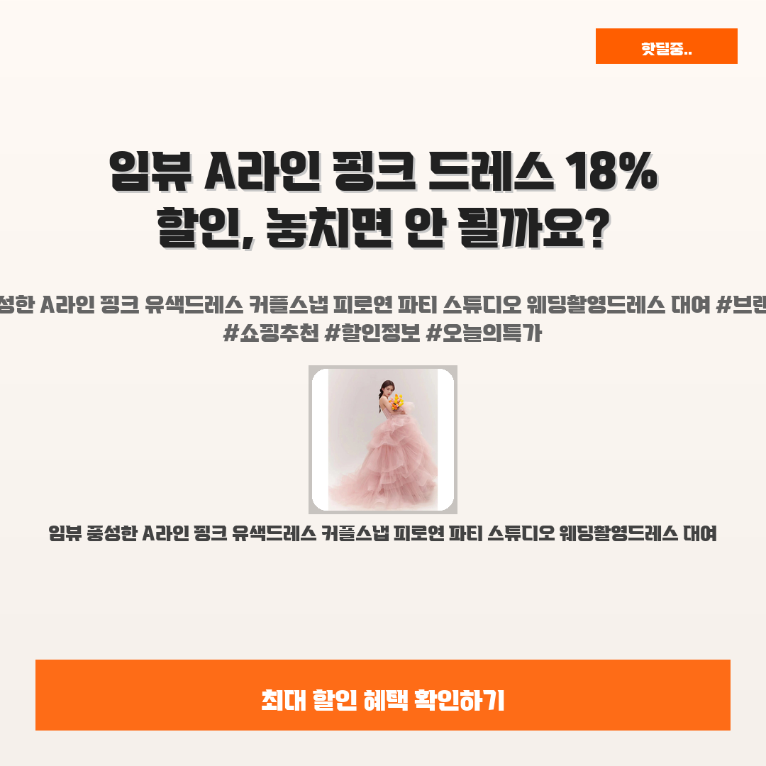 🛍️ 이 포스팅은 네이버 쇼핑 커넥트 활동의 일환으로,판매 발생 시 수수료를 제공받습니다.지금 주목할 아이템은바로 임뷰 풍성한 A라인 핑크 유색드레스입니다!특별한 날, 커플스냅이나 피로연 파티에 무엇을 입을까 고민하고 계신가요?그럴 때 필요한 완벽한 스타일과 편안함을 모두 갖춘 이 드레스는 여러분을 위한 해결책이에요!“와, 저 드레스 어디서 샀어요?” 하는 칭찬을 받을 준비가 되셨나요? 특별 할인된 가격에 만나볼 수 있는 이 기회를 절대 놓치지 마세요. 행복한 순간들을 이 드레스와 함께 만들어보세요!단순히 예쁜 드레스가 아니라, 완벽한 가성비까지 자랑하는 임뷰 드레스. 지금 확인해보시면 후회 없는 선택이 될 거예요!※ 이거 진짜 제가 직접 써보고 쓰는 리뷰예요 광고 아님!!임뷰 풍성한 A라인 핑크 유색..